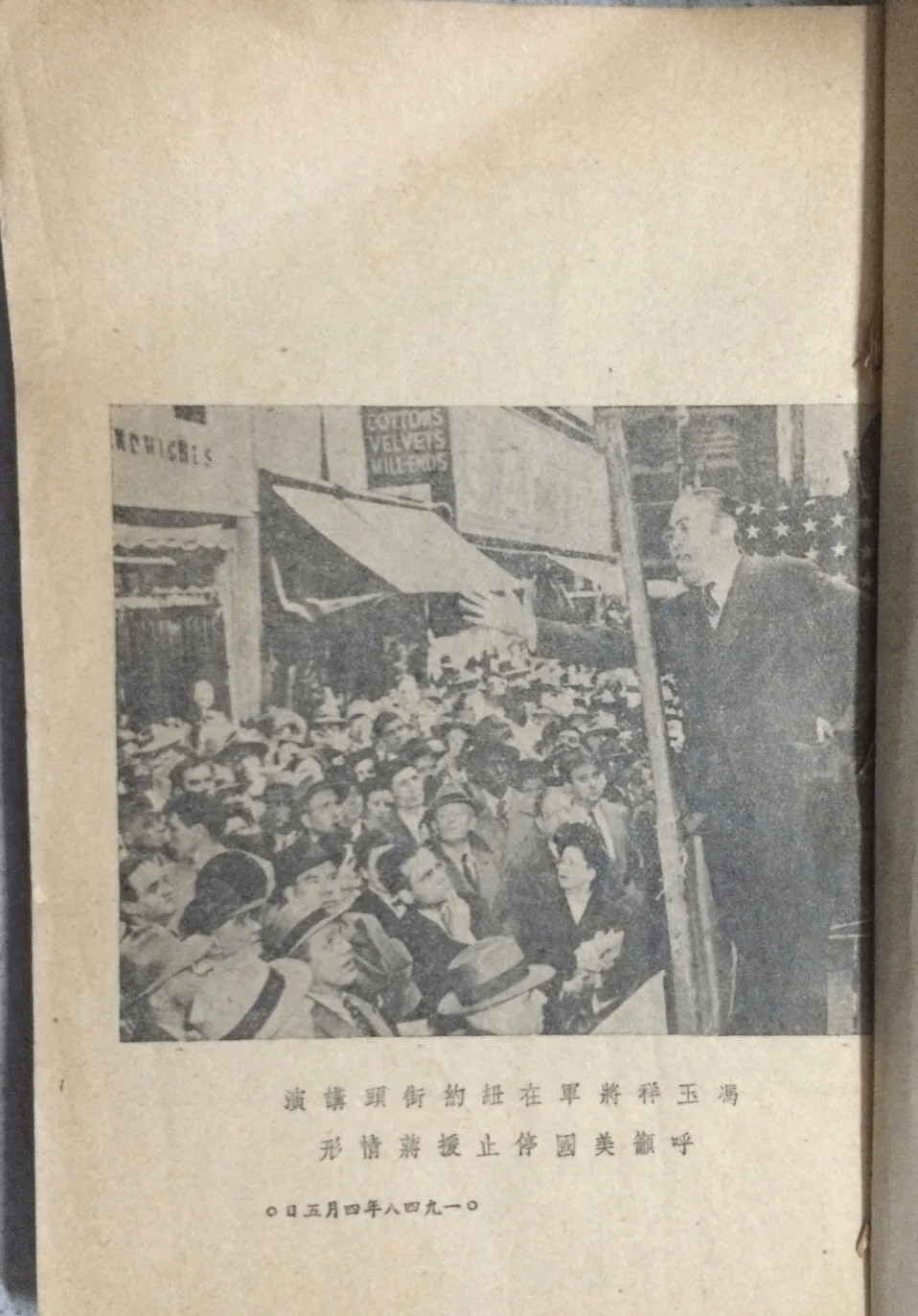 1948年4月5日,纽约街头,一位身着西装、身材魁梧的老者正挥舞着手臂慷慨陈词,呼吁美国停止援蒋,台下听者众多。演讲者正是冯玉祥。这一幕被相机拍下,半年后,成为《冯玉祥将军纪念册》中的一页插图。