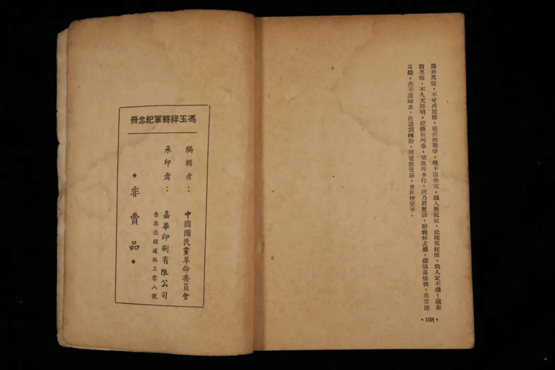 图为《冯玉祥将军纪念册》的版权页,注明该纪念册由中国国民党革命委员会编辑,嘉华印刷有限公司承印。